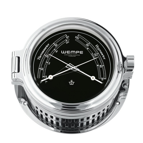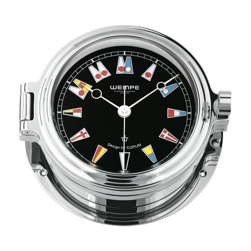 Wempe's exclusive Port Hole series is available with high-gloss or chrome-plated solid brass cases. The dial of the quartz clock is available either with Roman numerals or with nautical flags in "Design by CORUM." A convenient twist-lock closure on all models makes it easy to set the time, change the batteries, or readjust the instruments.